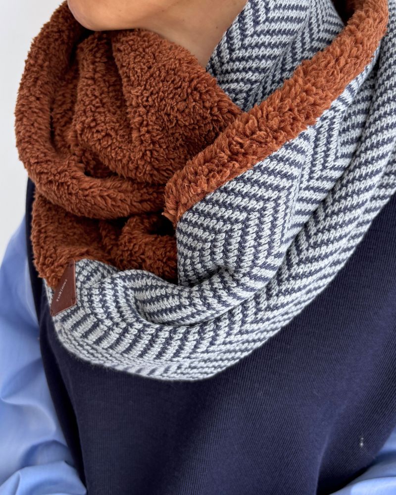 a classic herringbone knit paired with plush, cozy boa fabric.