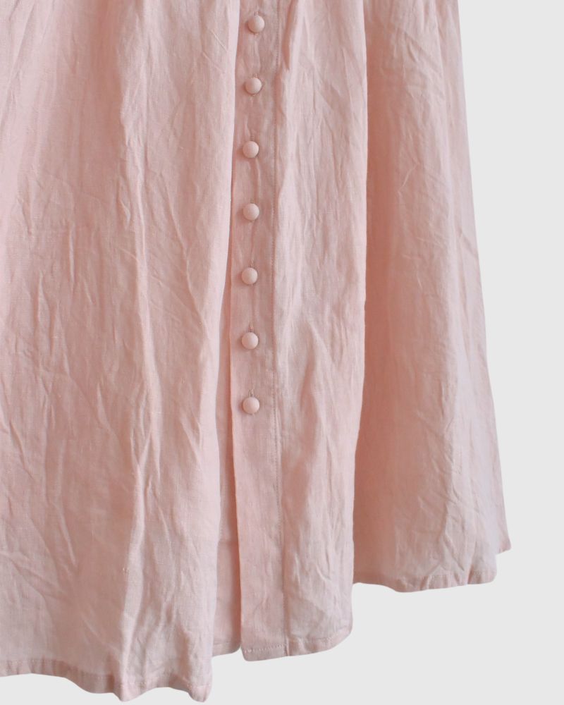 High-quality French linen with a washed-out atmosphere is used. It is characterized by the elegant luster and firmness peculiar to linen. The round covered buttons at the front add a cute accent. The gently flared silhouette sway softly as you move, creating a natural drape that goes well with the linen material. The elastic waistband and ties provide a comfortable fit. The longer you wear it, the more you can enjoy the way it changes over time, taking on the look and feel of vintage linen. Cotton lining allows you to wear it without worrying about transparency.