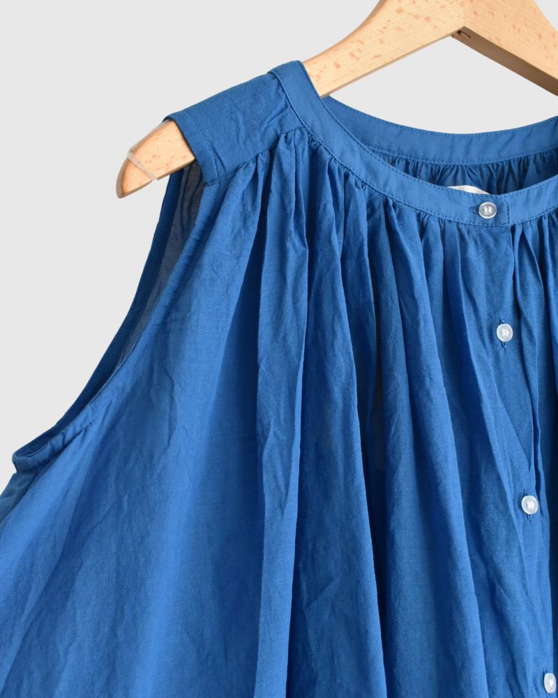 This gathered blouse has a lovely, fluffy silhouette. The gathers at the neckline give a simple yet feminine impression. The button closure makes it easy to put on and take off, and it can also be worn as a layered style. It can also be used as a woven top with the front open. The sleeveless, clean silhouette with plenty of delicate gathers creates a flattering silhouette and a laid-back feel. Made of high quality 100% cotton, it is thin, lightweight, and has a light and airy feel. It is a very refreshing item. Made in Japan