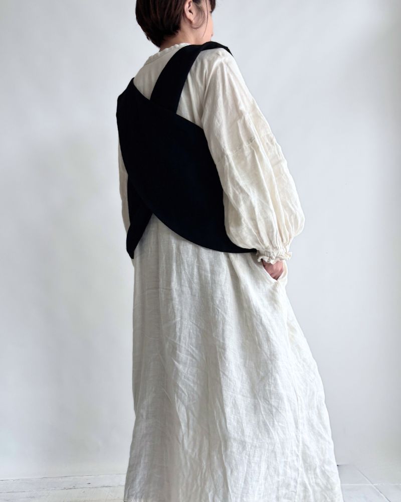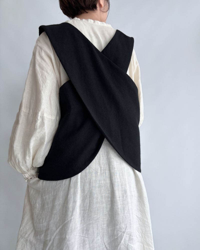 A soft, lightweight vest crafted from brushed flannel wool with a warm and cozy texture. The simple front contrasts beautifully with the dramatic crossover back, creating an elegant drape and a sculptural silhouette. The cotton lining ensures a smooth and comfortable feel against the skin, making it ideal for layering over shirts, blouses, or dresses. An effortless piece that adds warmth, depth, and sophistication to your autumn and winter styling. made in Japan